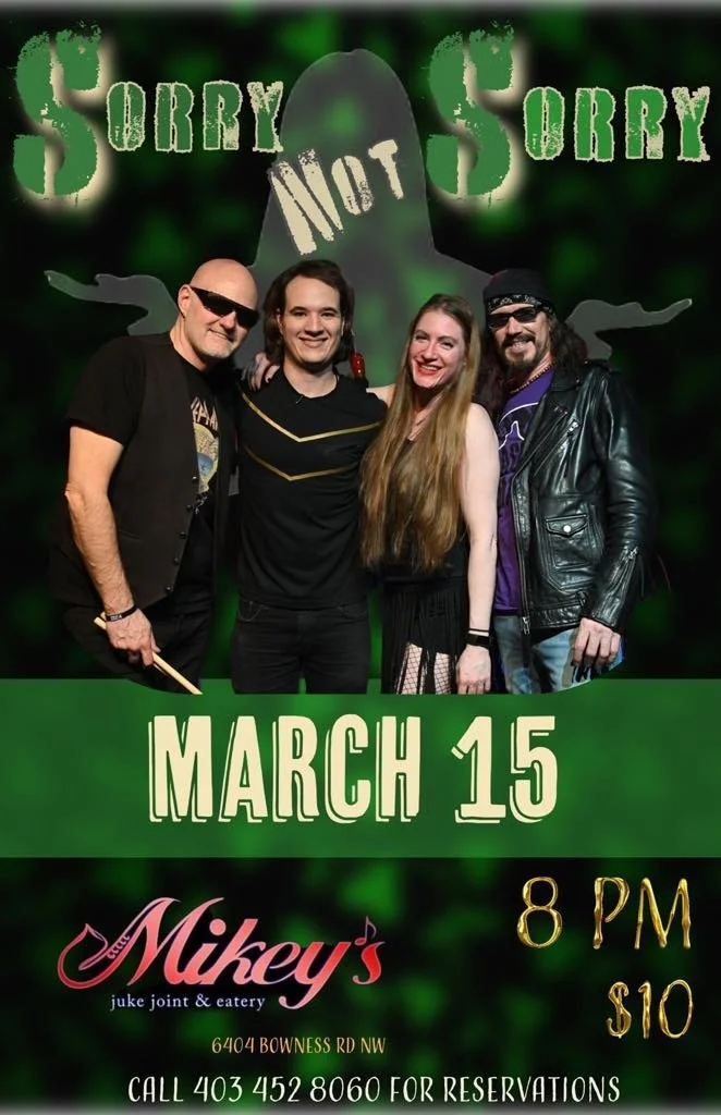 Sorry Not Sorry Saturday, March 15, 2025 3:00 p.m. 11:59 p.m. 15:00 23:59 Mikeys Juke Joint 109 - 6404 Bowness Road Northwest Calgary, AB, T3B 2B9 Canada (map) Google Calendar ICS Rock your Sock Off with this Killer Band doing all your favourite tunes!