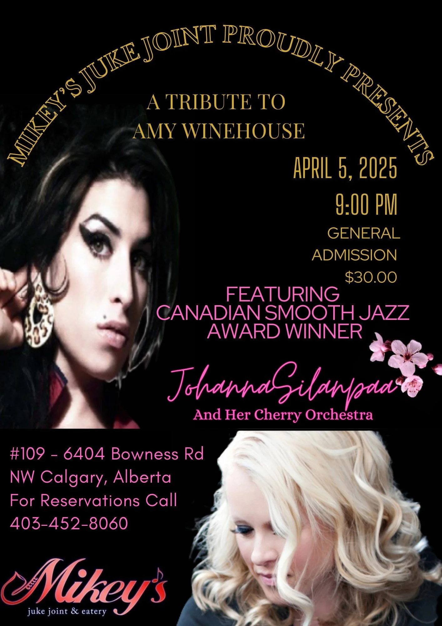 An Evening of Amy Winehouse Featuring Johanna Sillanpaa Saturday, April 5, 2025 9:00 p.m. 11:59 p.m. 21:00 23:59 Mikeys Juke Joint 109 - 6404 Bowness Road Northwest Calgary, AB, T3B 2B9 Canada (map) Google Calendar ICS