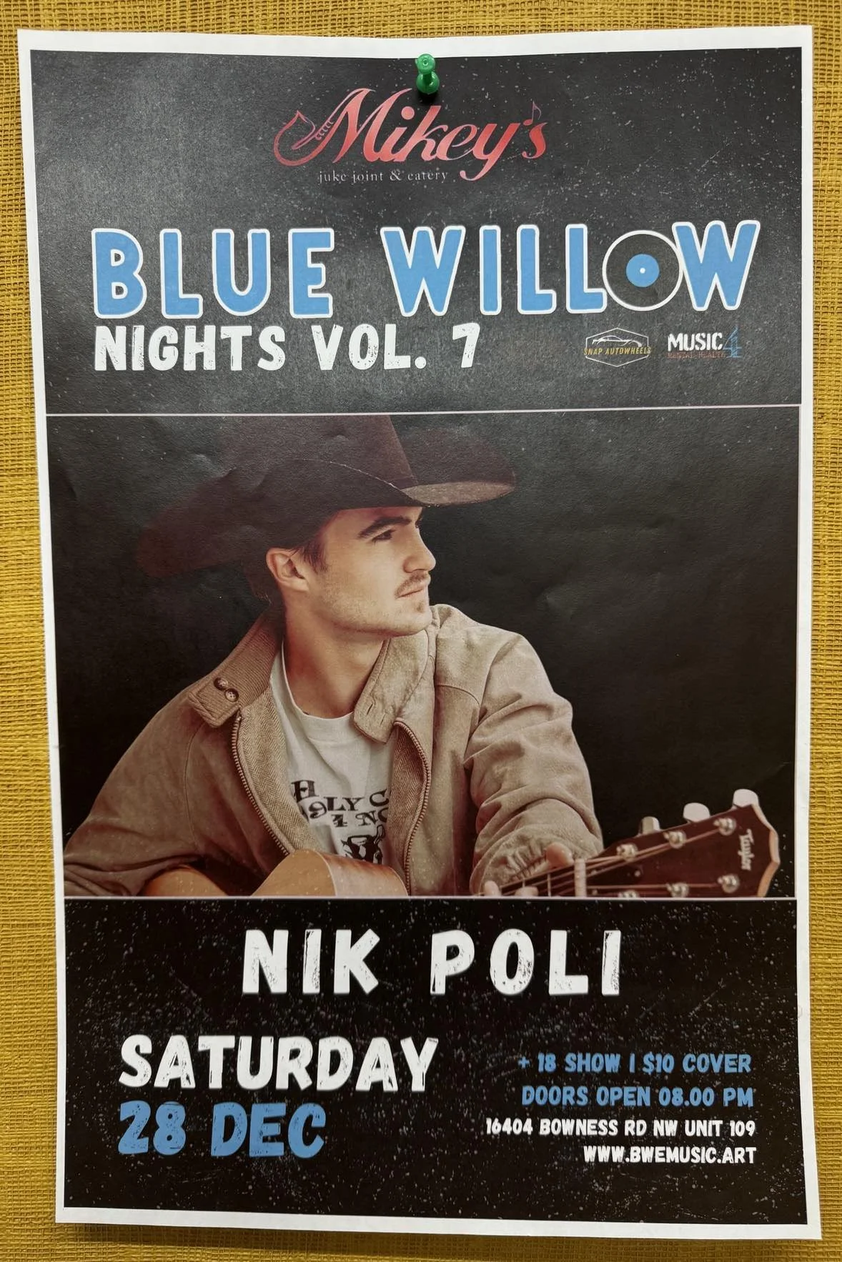 ENJOY MIKE CLARK BAND’S FAMOUS BLUES JAM THIS AFTERNOON from 3:00 until 7:00...THEN AT 8:00 BLUE WILLOW NIGHTS Volume 7: THE NIK POLI BAND!!!!