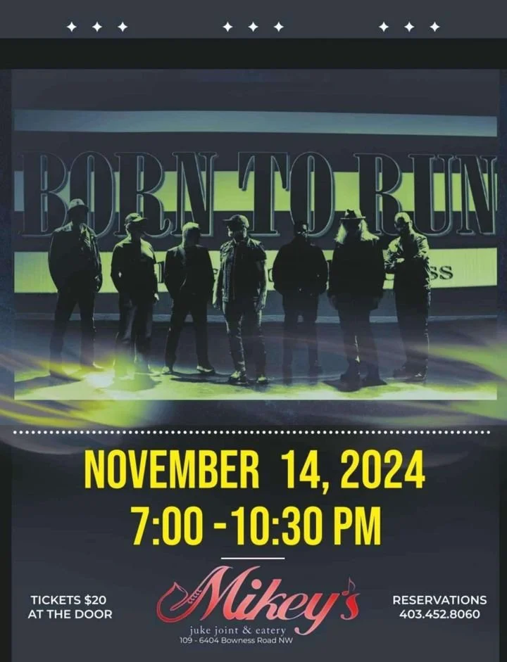 COLD GARDEN PRESENTS: Mikey’s BORN TO RUN BRUCE SPRINGSTEEN TRIBUTE! @ 7:00 PM!!! Thursday, November 14, 2024 7:00 p.m. 10:59 p.m. 19:00 22:59 Mikeys juke joint 109 6404 Bowness Road NW Calgary, AB, T3B -0E7 Canada (map) Google Calendar ICS COLD GARDEN PRESENTS:mikey’s BORN TO RUN BRUCE SPRINGSTEEN TRIBUTE!@ 7:00 PM!!![$20 COVER] A TRIBUTE TO ‘THE BOSS!’ Stop by have some Thursday Beers & Vino, Cocktails or our delicious Mikey’s juke joint food!!![$20 COVER]