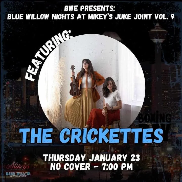 COLD GARDEN PRESENTS: BLUE WILLOW NIGHTS VOL. 9 we welcome THE CRICKETTES! Thursday, January 23, 2025 7:00 p.m. 10:59 p.m. 19:00 22:59 Mikeys juke joint 109 6404 Bowness Road NW Calgary, AB, T3B -0E7 Canada (map) Google Calendar ICS COLD GARDEN PRESENTS: BLUE WILLOW NIGHTS VOL. 9 - we welcome THE CRICKETTES!@ 7:00 PM!!! [NO COVER]