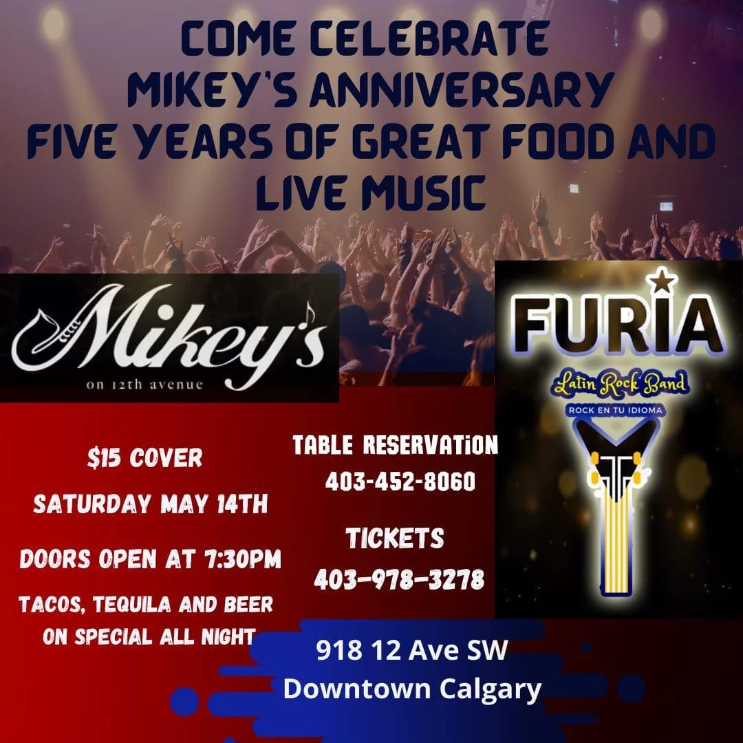 OUR FIVE YEAR ANNIVERSARY! COME ENJOY MIKE CLARK BAND’S FAMOUS BLUES JAM! ...then tonight: WE HAVE THE LATIN ROCK GROOVES OF FURIA!!! Saturday, May 14, 2022 3:00 p.m. 11:59 p.m. 15:00 23:59 Google Calendar ICS ENJOY MIKE CLARK BAND’S FAMOUS BLUES JAM! MIKE CLARK BAND! Tonight:FURIA!!!LATIN ROCK!8:30 PM[$15 Cover] FURIA!!!