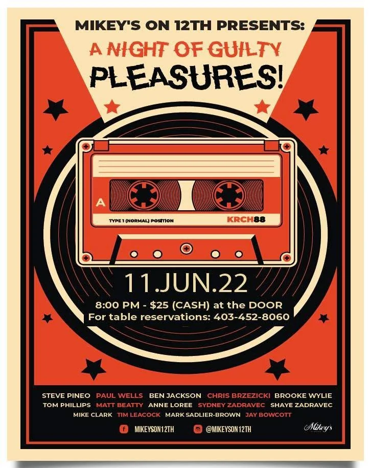 The band - Steve Pineo, Paul Wells, Chris Brzezicki, Ben Jackson with backing vocals form Brooke Wylie, Sydney Zadravec and Shaye Zadravec - will be supporting a great line up of local Calgary musicians who have chosen some of their guiltiest pleasures to share with you!